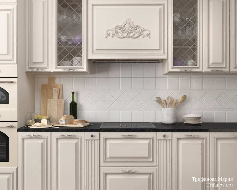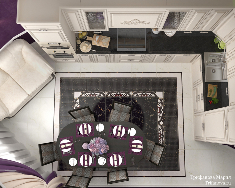 Кухня - самое неординарное помещение во всей квартире. Сочетание белого кухонного гарнитура и темного насыщенного цвета стен выглядит эффектно и необычно. Кухня не для всех, для кого-то такое обилие контрастов покажется перебором, но мы остались довольны! Заказчица пришла ко мне с фотографией, и сказала: "Хочу также!" На фото была изображена белая кухня на фоне черно-фиолетовых стен. Тогда я поняла, что работа будет весьма интересной)