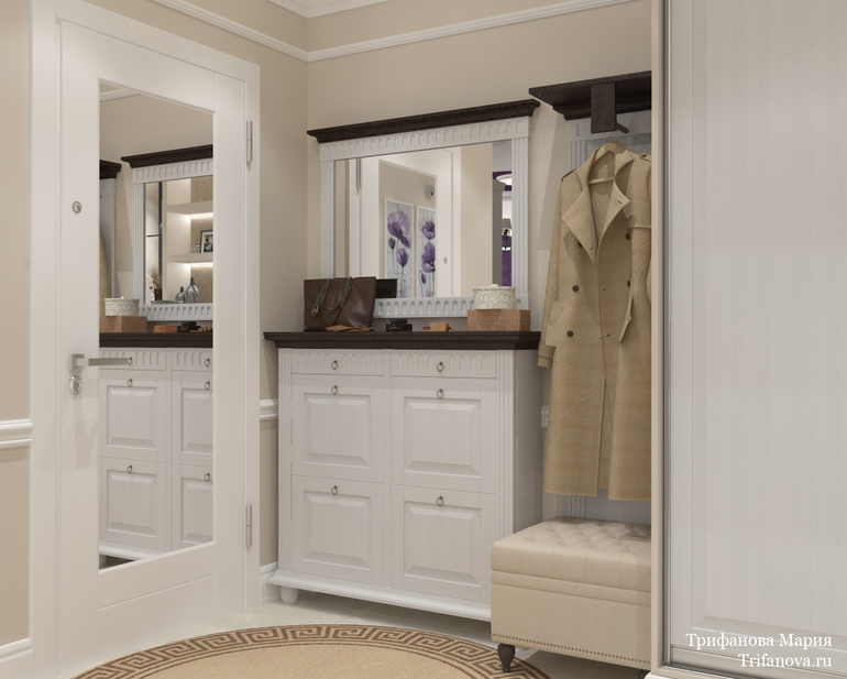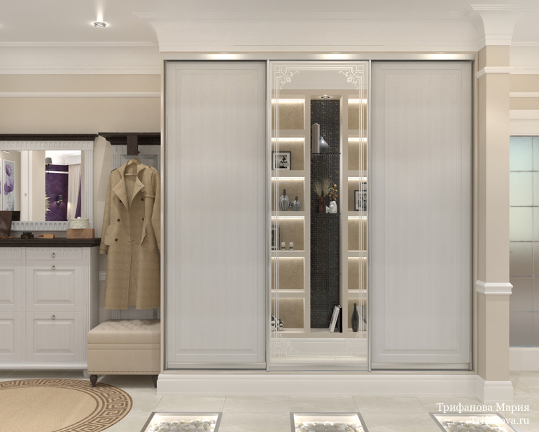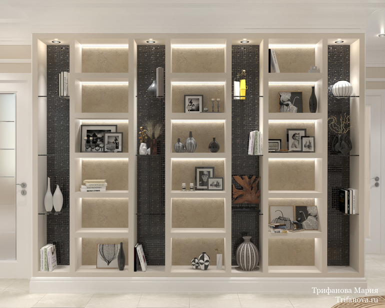 Из кухни мы попадаем в просторный коридор. В нем расположился большой шкаф-купе для крупногабаритных вещей. Напротив шкафа главное украшение коридора - встроенный стеллаж с подсветкой для разных мелочей (пожелание заказчицы). Задние стенки стеллажа отделаны черной мозаикой и декоративной штукатуркой в бежевых тонах. Входная дверь белая с зеркальным полотном.