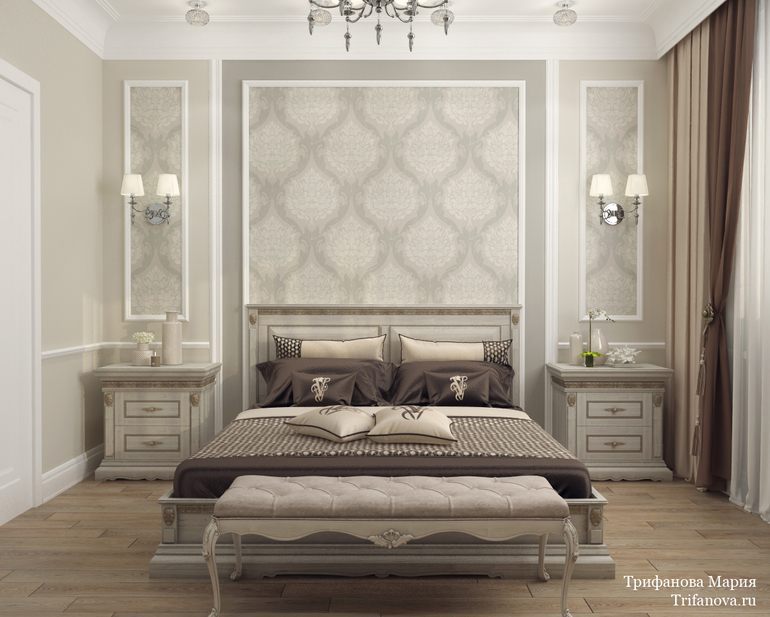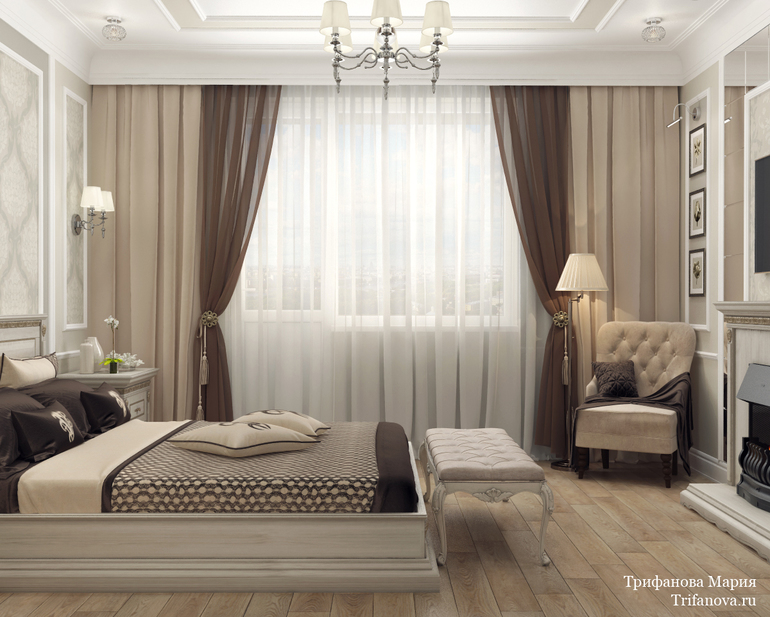 Родительская спальня отделана в спокойных бежевых тонах, но за счет богатой лепнины не выглядит скучно. Спальный гарнитур с благородной патиной удачно вписывается в общую атмосферу. Камин и ТВ обрамляет декоративная рамка из зеркальных плиток с фацетом. Одна из дверей ведет в гардеробную, возле нее расположилось широкое зеркало в полный рост. Кресло и торшер образовали уютный уголок для чтения.
