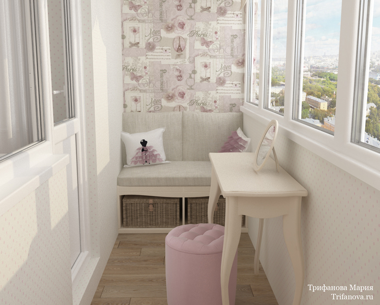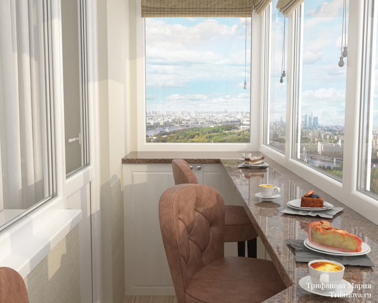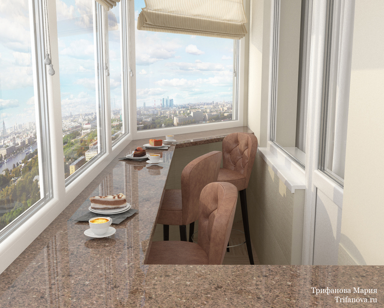 На балконе получился уголок релакса, где можно потягивать любимый напиток, любуясь красивыми видами вечернего города.