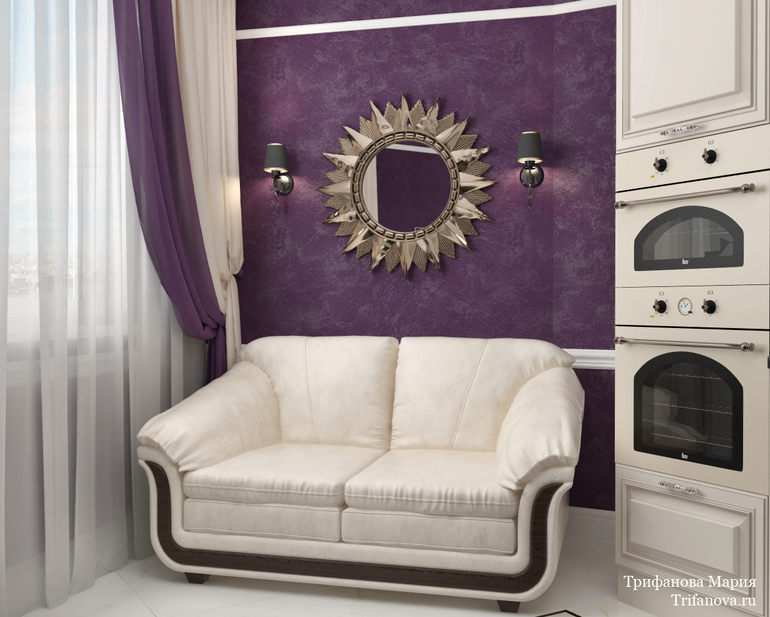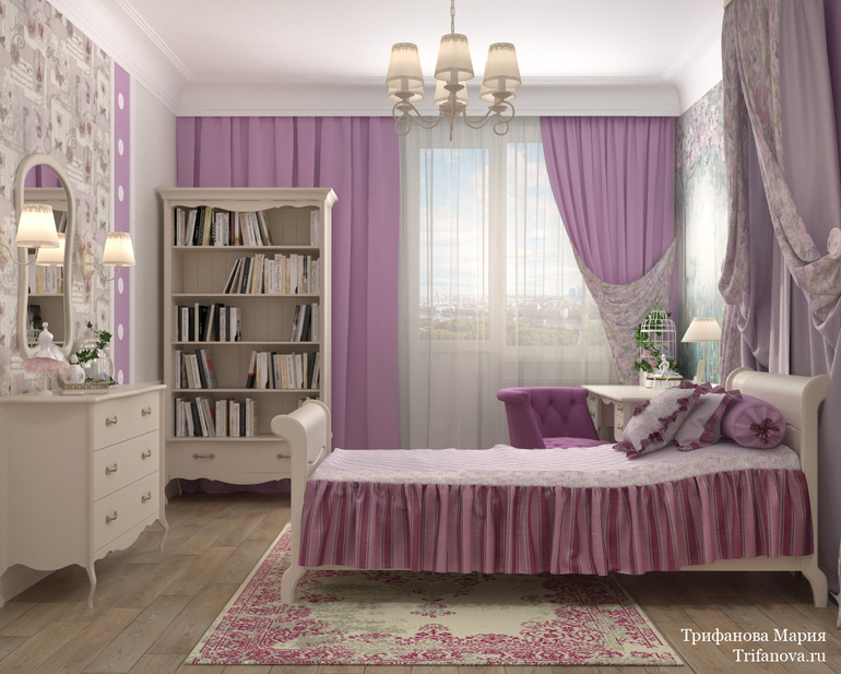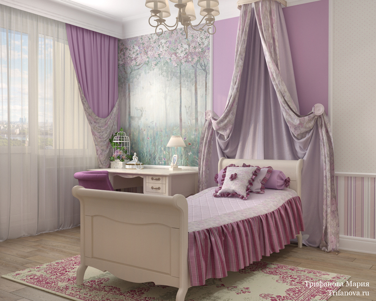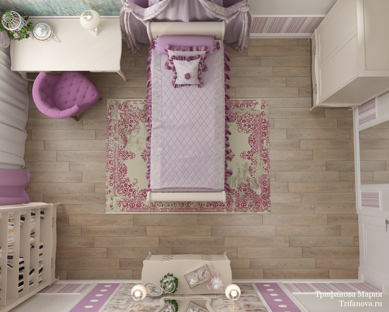 А вот первый неутвержденный вариант этой детской в другой цветовой гамме. Девочка оказалась ярой поклонницей сиреневых оттенков) Напишите в комментариях какой вам больше нравится!