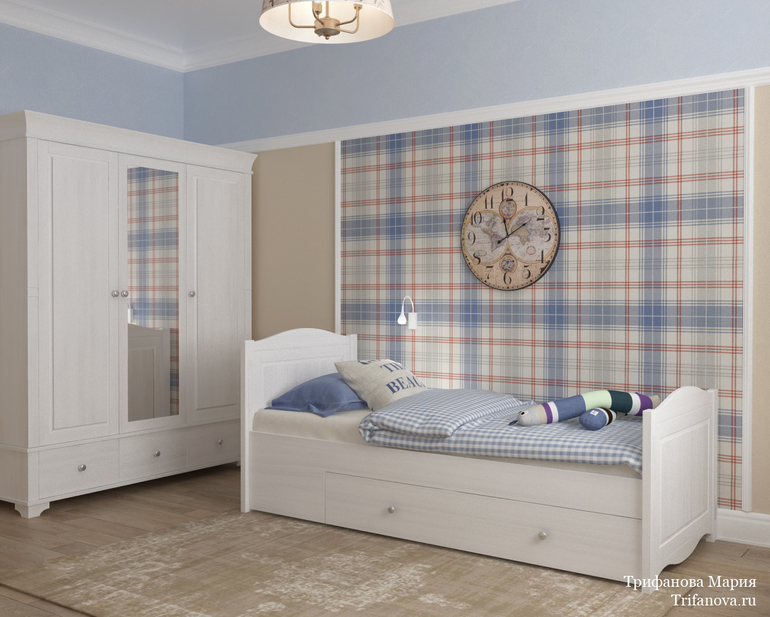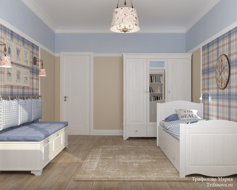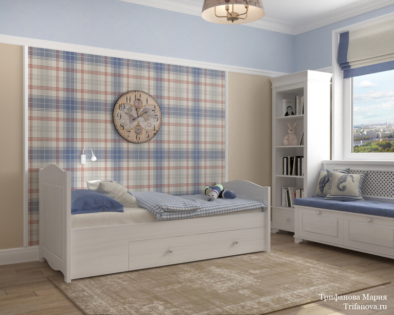В детской сына прослеживаются ненавязчивые мотивы морской тематики. Комната решена в бело-голубой гамме. На часах, люстре и бра изображения состаренной карты. Под окном встала банкетка с мягкими подушками, а экран скрыл от посторонних глаз батарею. Сынок пока совсем маленький, так что рабочий стол понадобится еще не скоро. В дальнейшем на место банкетки встанет парта.