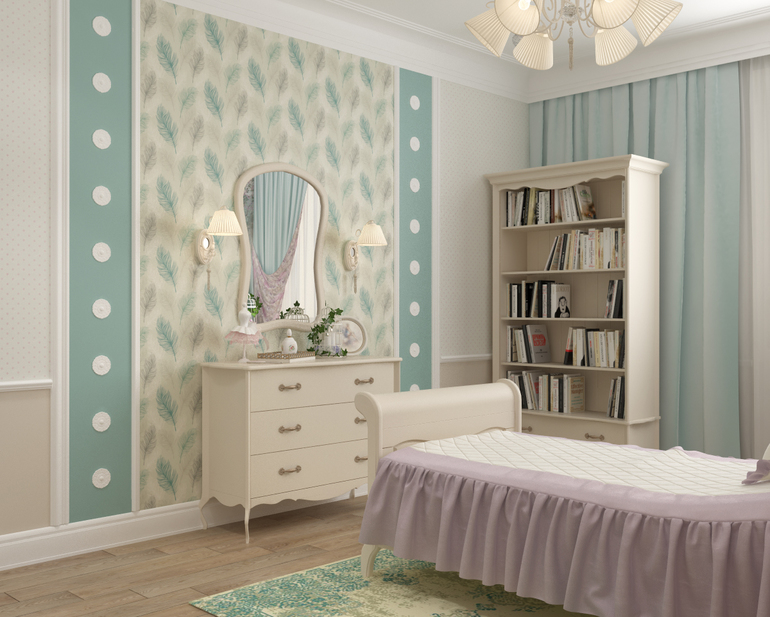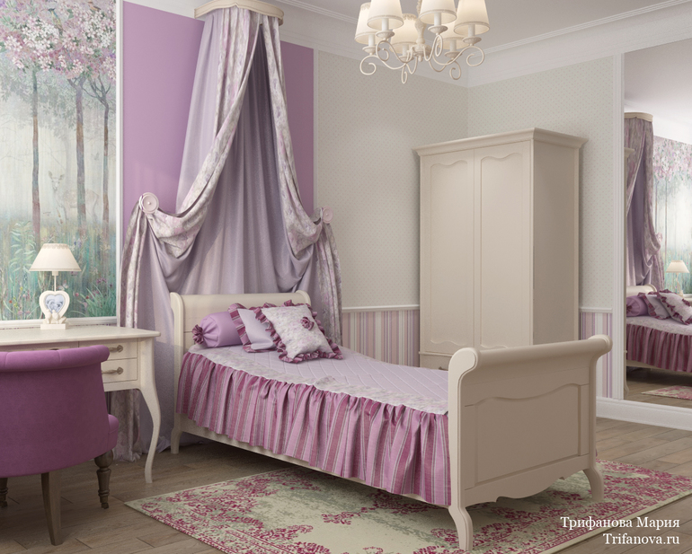 Детская для старшей дочки - единственное помещение, в котором были правки по цветовой гамме. Показываю утвержденный вариант. Сказочная фреска над рабочим столом очень удачно вписывается в девичью комнату. Фреска задает цветовое решение всей остальной комнате: сиреневые оттенки цветов удачно сочетаются с текстилем в той же гамме. Родители решили не делать в детских телевизоры, так что над комодом вместо привычного ТВ висит красивое зеркало.