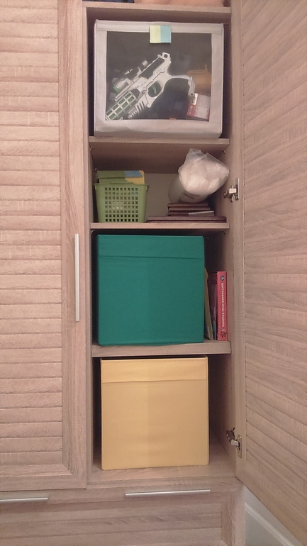 Крупные игрушки спрятали в шкафу в икеевских коробках: