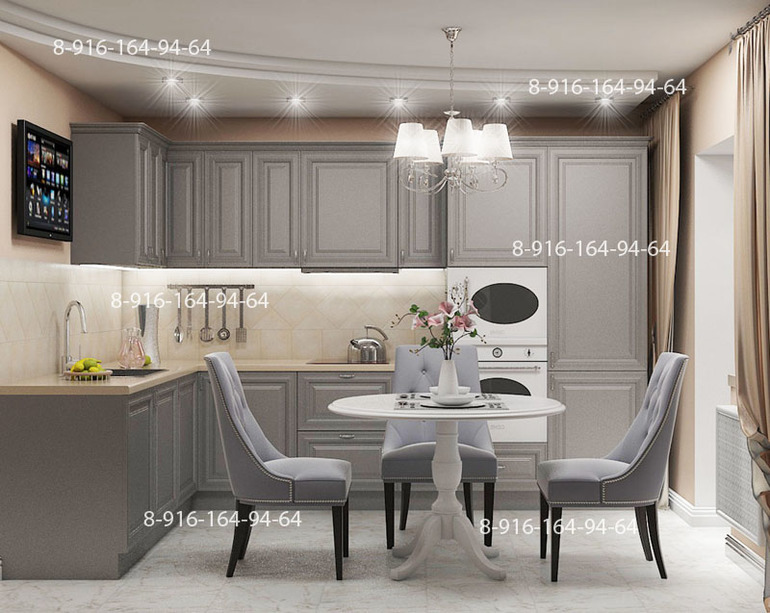 Кухня выполнена в сером цвете с классическими фасадами, дополнительная подсветка в верхних шкафах. Закругленный потолок с точечными светильниками.