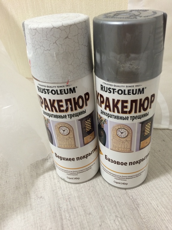 Состав см. на фото. Купили в Леруа мерлен краску в баллончиках, базу серого цвета и верхнее покрытие, тот самый эффект кракелюра. На всю кровать ушло по 2,5 баллончика каждой краски. Суммарно 6 баллонов по цене в 700 рублей. Но это всяко дешевле чем новая кровать. Дополнительно приобрели аэрозольный лак- 400 руб. за флакон, его хватило на все детали.