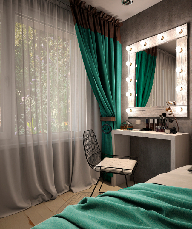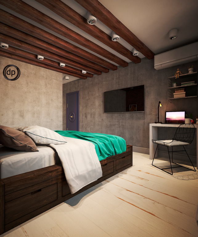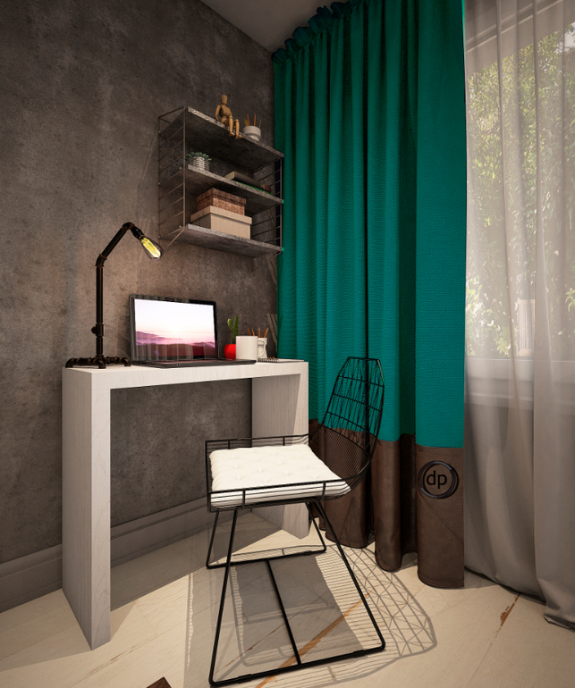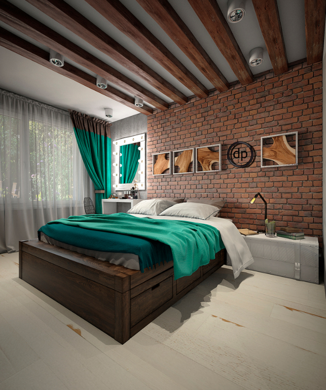 Работая над спальней, очень хотелось не отходить от общего концепта, но и не хотелось перегружать. Когда интерьер был готов, я видела, что получилось именно то, что было и необходимо! У нас разместилась вся необходимая мебель и при этом не пришлось отказываться от элементов, присущих стилю Loft. А изумрудно-бирюзовый цвет освежает и делает интерьер мягче.