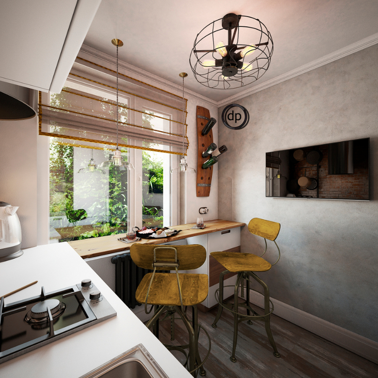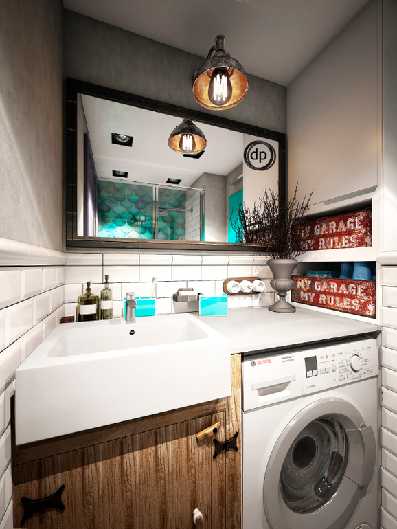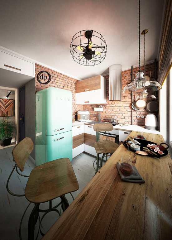 Площадь кухни небольшая и мы решили не перегружать интерьер лишней мебелью. Изобразив несколько вариантов кухонного гарнитура, мы приняли решение, что лучший вариант - это вовсе отказаться от части верхних шкафов! По материалам все очень «лофтово»: часть стен мы отдали под кирпич, часть-под «бетон», на полу светлая плитка с эффектом потертости. Ну и конечно не обошлось без интересных решений. В данном помещении это подставка под вино в виде бочки и газовая труба, которую мы замаскировали под интерьер: