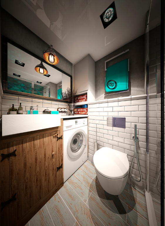 Когда дело дошло до ванной, то я уже точно знала, что и как там будет. После одобрения прихожей и кухни, в голове сложилось сочетание текстур, фактур и цветов. Не долго думая, я взяла уже давно всем знакомую и любимую плитку «кабанчик» и решила сочетать ее с «бетоном», разбавив интерьер яркими цветовыми акцентами в душевой зоне и напольном покрытие.