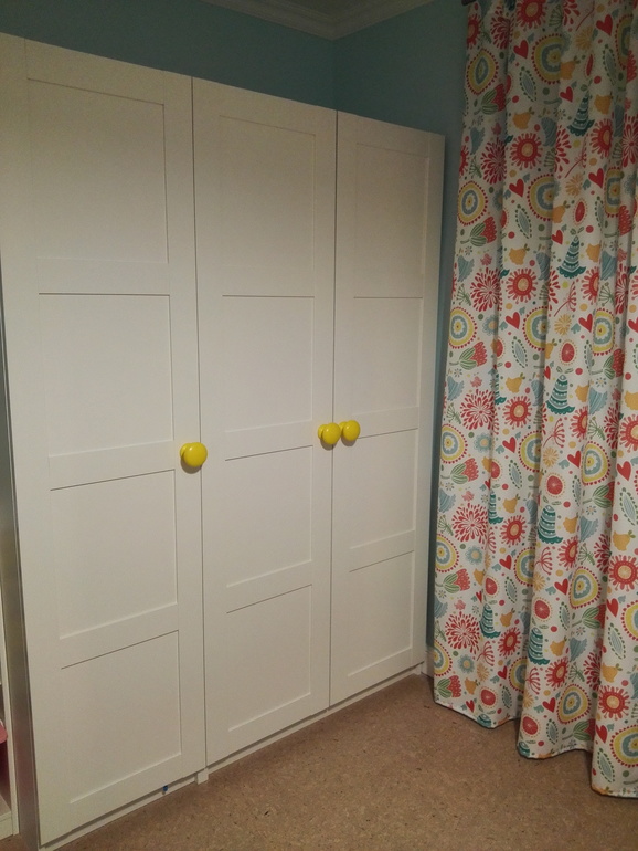 Я бы не стала перегружать интерьер детской яркими тонами, по мне, так я бы сделала или в цвет вашей двери или молочные. можно конечно и молочные в голубых крупных рисунках конторах, типа ваших обоев.
