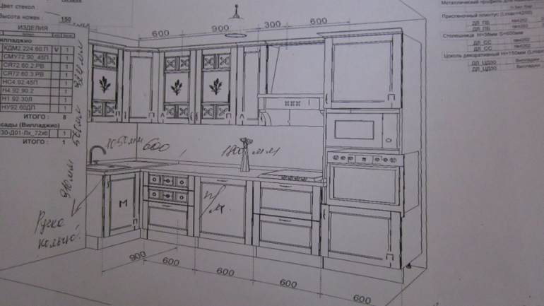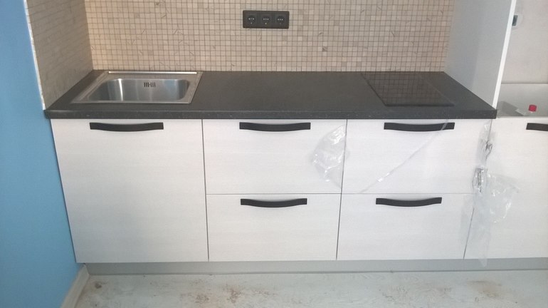 Меня, как и всех, смущает расположение варочной панели. Идеально было бы, если бы плита стояла по центру. Если планируете плиту 30 см., то желательно установить ее вровень со столеницей, чтобы плита была с сенсорным управлением. При расположении плиты по центру у Вас по бокам будет по 75 см., с каждой стороны, этого вполне достаточно для разделочной зоны, а если плита будет вровень со столеницей, то и ее можно использовать как доп. зону. Да и визуально верх и низ будут выглядеть симметрично, а сейчас все смещено и смотрится зажато. Мойку я бы сделала с небольшим крылом, чтобы в угол можно было поставить чайник, тостер и т.д., чтобы разделочную зону не занимали.