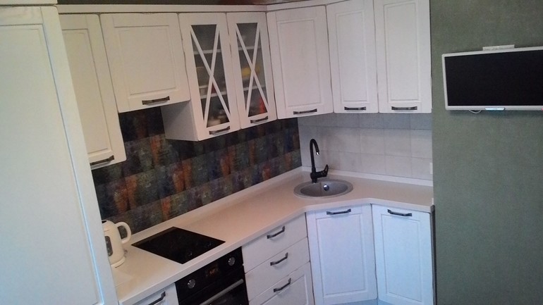 Мне нравится, кроме не симметричности верхних и нижних шкафов. А что, если верхний угловой шкаф не делать скошенным. Тогда можно будет верхние шкафы сделать симметрично нижним.