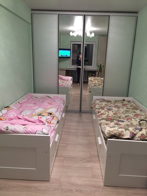 Комната для двух девочек 7 и 5 лет ( уже 8 и 6 лет) шириной 2,40 см так что особо не разгуляешься.