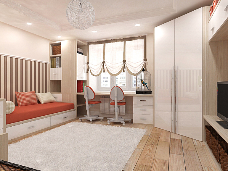 Мы сейчас делаем примерно такого плана. У нас комната длинная и узкая, поэтому также стол у окна от стены до стены, слева двухъярусная кровать, шкаф, а справа игровая зона будет.