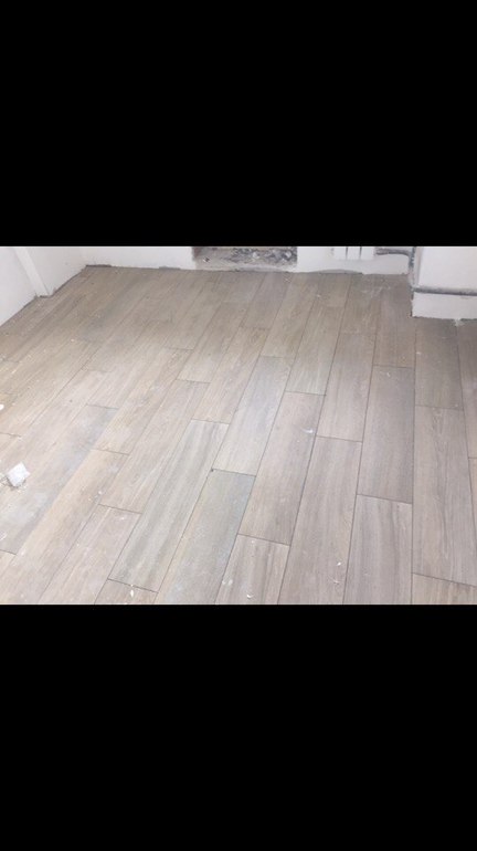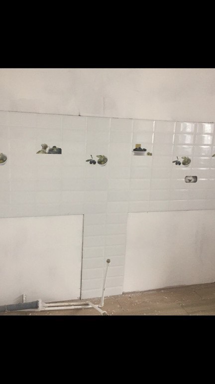Голубая покраска всё же будет заменена на плитку. Далее переход в коридор. Также полностью в плитке.