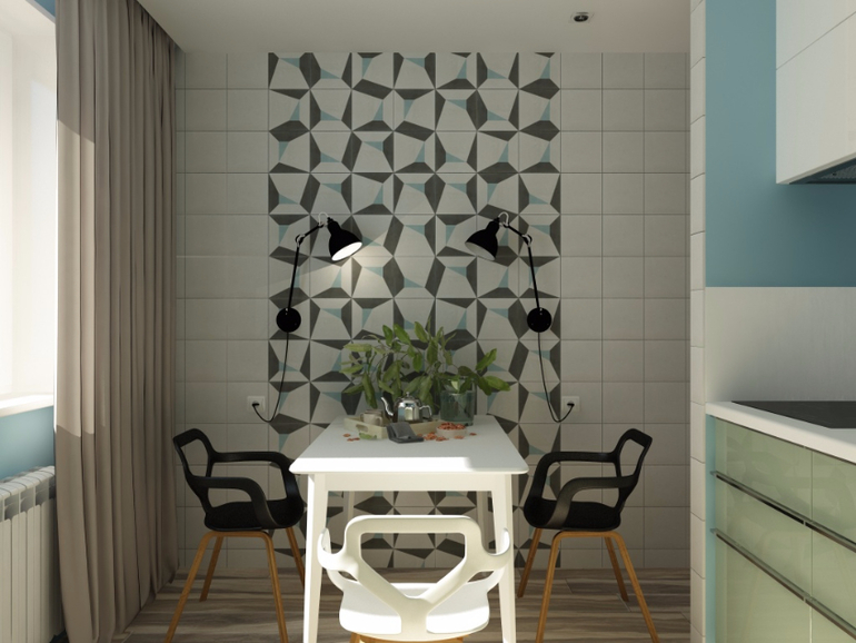 Плитка на стенах- необычно, но хуже от этого проект не становится, наоборот, индивидуальность