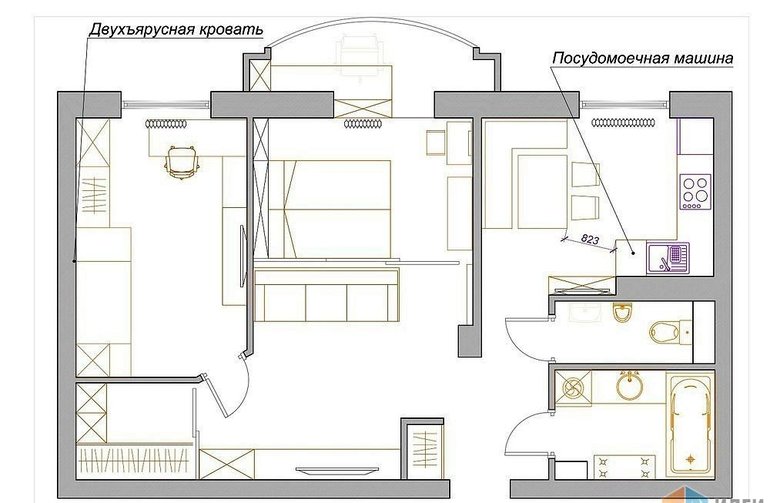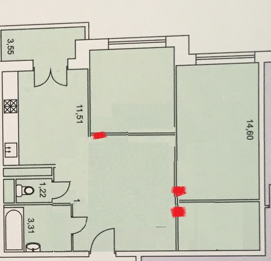 Может, как-то так) примерно. комната 14,6 детская, отгороженная от 17 квадратов спальня, в свободной зоне гостиная, на балконе кабинет д/мужа. Ну и с/у моно увеличить, но незаконно)). Рядом с комнатой 14,6 гардеробная.