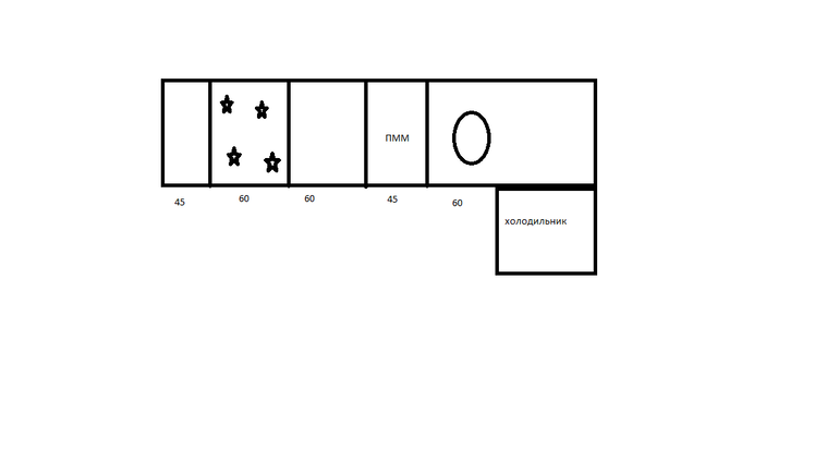 У нас такая планировка. Но кухня с коридором небольшим, поэтому холодильникам только дверка на кухне, все остальное в шкафу в коридоре как-то так...) где пустое место, там сейчас ПММ. А с угла у нас стиралка стоит
