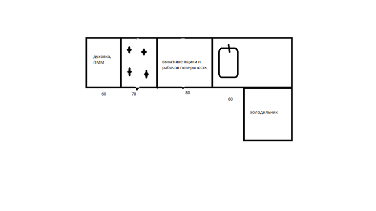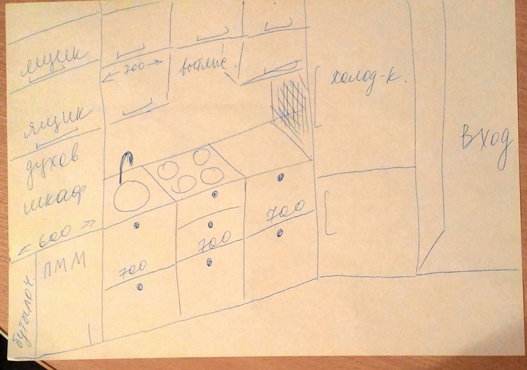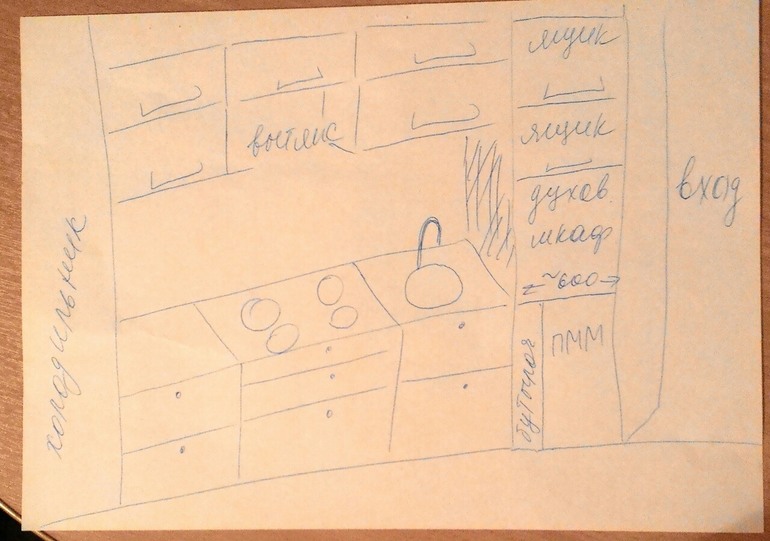 А если еще хорошо подумать, то духовку можно оставить под варочной. Возле мойки поставить ПММ, ящики, варочную и ящики. Холодильник возле входа. В такой маленькой кухне холодильник и пенал это много. И в таком варианте у вас получается 95 см основной рабочей поверхности