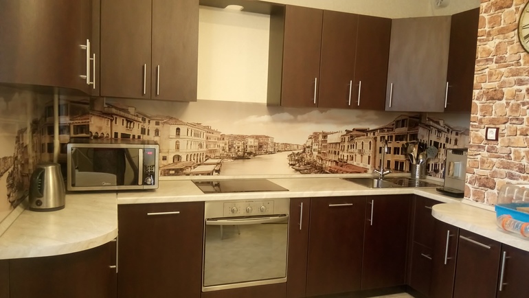 скиналь отлично подошла к фасадам! а вы не хотите микроволновку и чайник переставить в правую часть под часы, а этот угол с плитой стал бы шикарной рабочей зоной?