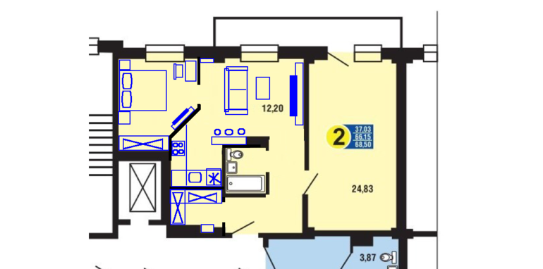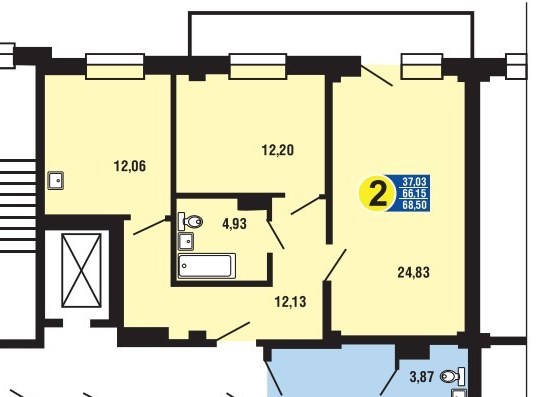 Добрый день, Кухня получается 12,06? Странно, два стояка в двухкомнатной квартире.