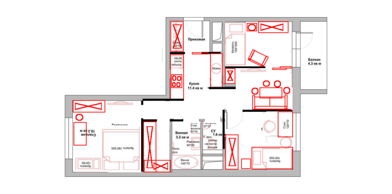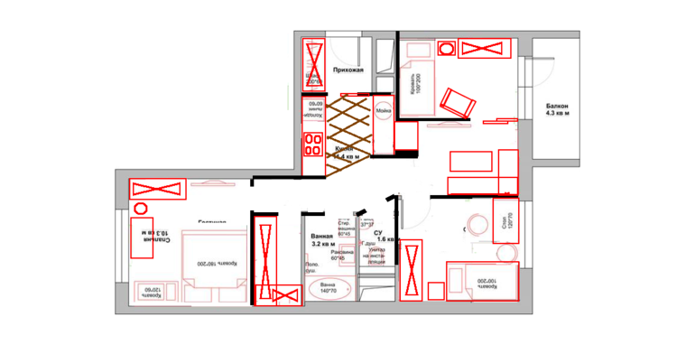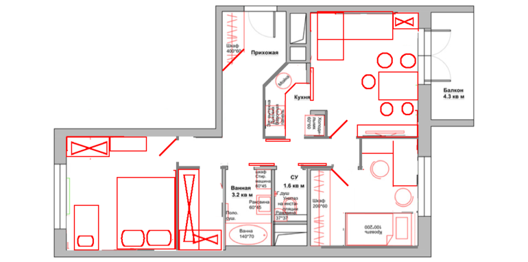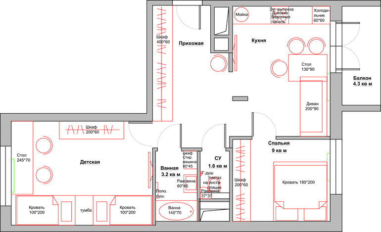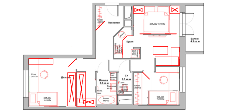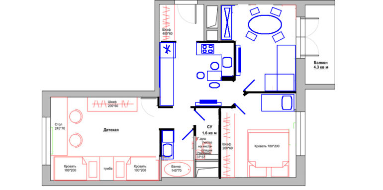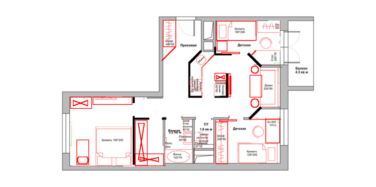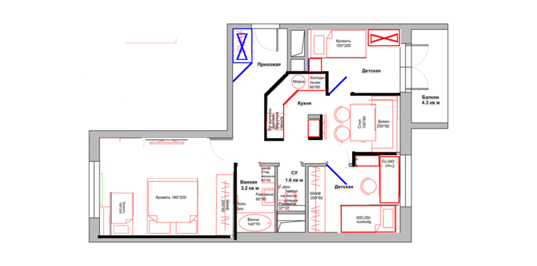Задумка у заказчиков такая: Утром кофе попить бутерброд сесть в кухне за маленький столик, а вот ужин когда вся семья вместе то в большой комнате за большим столом (бабушка молодая 50 лет и очень хорошо выглядит и живет с ними временно). Главная задача проекта, чтобы у детей в будущем были свои отдельные комнаты, а у родителей своя спальня. Заказчики категорически против чтобы был совместный су с ванной, дверь из туалета не должна быть в кухне, как можно больше сделать спальни, прихожая и кухня не особо важны, балкон нужно оставить, там будут велики, шины ну и всякое такое храниться.
