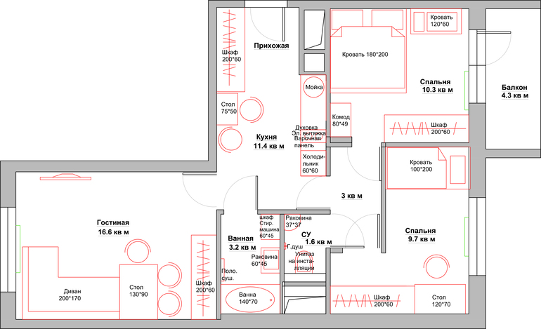 5) Комната родителей - в комнате 16,6. Шкаф по стене, где сейчас ТВ. Стол и стулья к окну. Диван обычный (не угловой) по стене, где сейчас шкаф стоит.