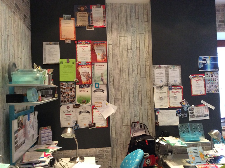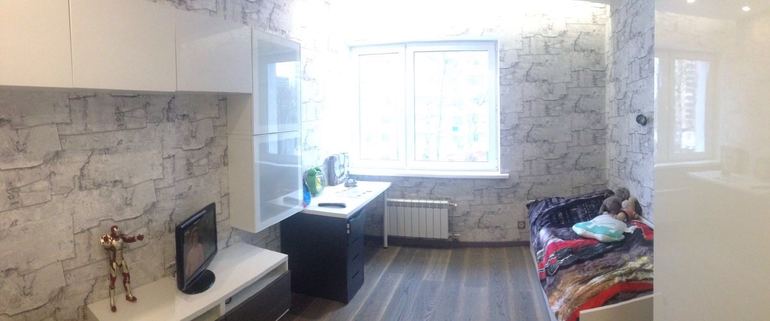 Детская нашего мальчика. У нас не обои, а плитка под кирпич. Мне так больше нравится. Очень уютная комната получилась, навырост, можно сказать. Сыну 8 лет.