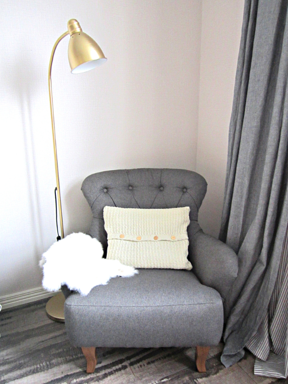 Появилось новое кресло с ножками в цвет тумбы. А еще я покрасила в золото лампу)))