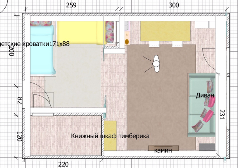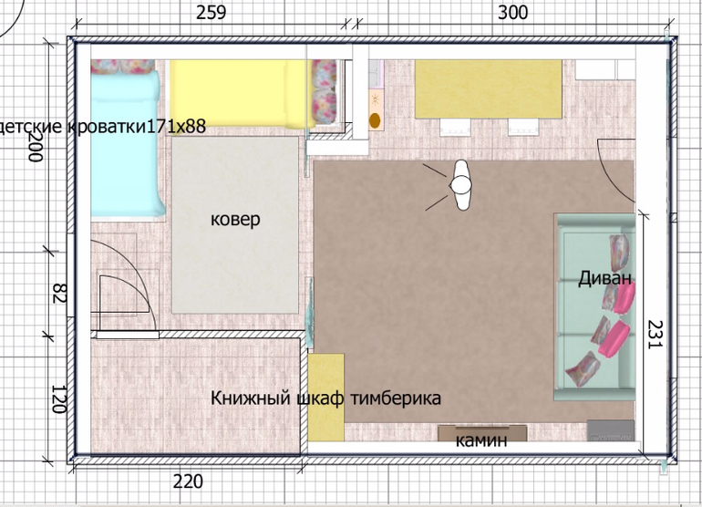 Второй вариант - "состыковать" две зоны.. Но тогда детская рисовально-игровая без ковра остается?? (Там, где столики). С одной стороны, вроде логично - краски, вода, пластилин..
