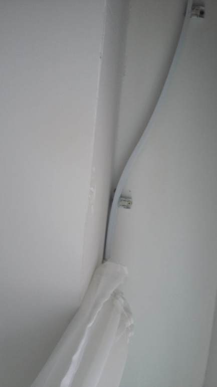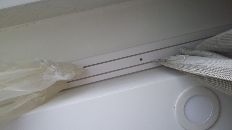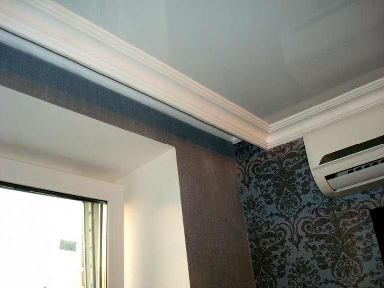 В детской и нашей спальне такой же плоский карниз, но просто на потолок натяжной прикреплены. Поищу фото и добавлю. На кухне на стену круглый карниз. Вообще все зависит от стиля помещения. Все индивидуально. Например, в детской у нас лекоративная английская шторка, в спальне от потолка до складок на полу портьеры, в кухне тоже чисто декоративная портьера-стену со стояком прикрывает)