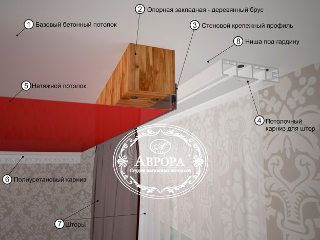 У нас такие потолки. Насколько знаю, построиои гипсокартонную штуку и за нее зацепили потолок,а карниз за ним. В комнате обычный. А на кухне окно полуэркер, карниз купили гибкий и прицепили боком к гипсокартону.