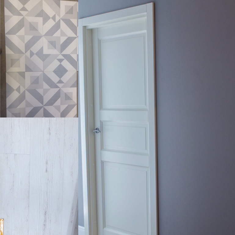 У нас входная белая с фактурой дерева, межкомнатные белые без фактуры. В принципе входная не сильно выделяется, цвет то один. И те и те матовый пластик. Плитка прям ммммм, очень красивая, моя любимая геометрия! Серые стены тоже супер!
