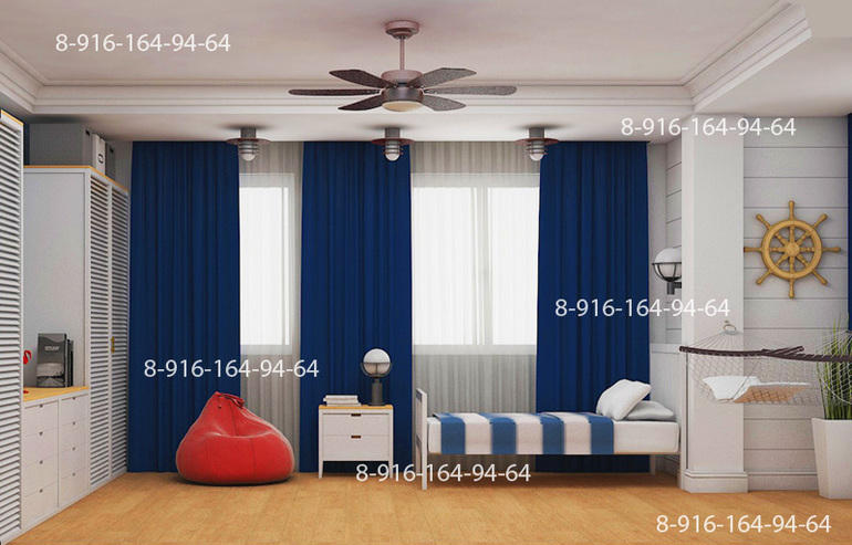 Техническое задание для помещения: назначение комнаты - детская, просьба заказчика сделать детскую "в морском стиле", две кровати, тумбы прикроватные, шкаф для одежды, ТВ.