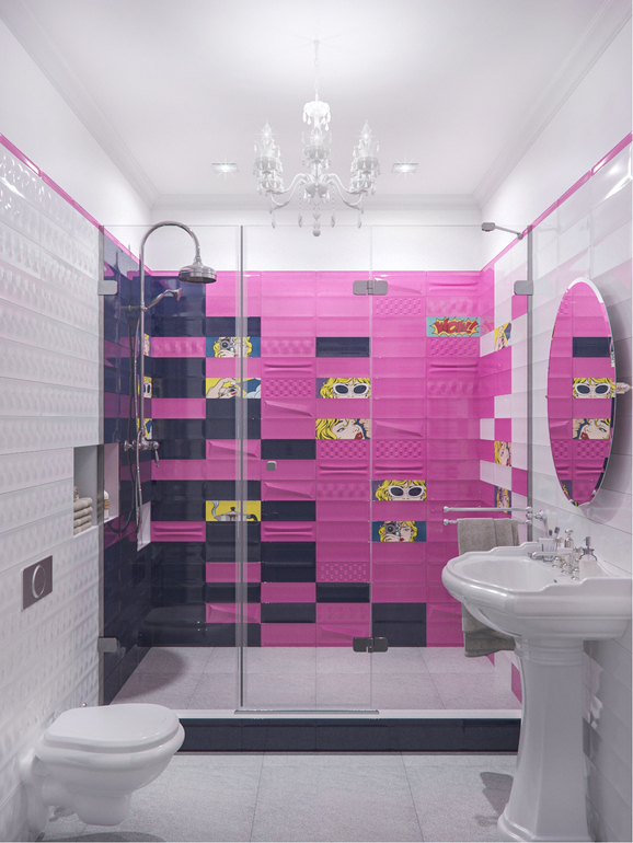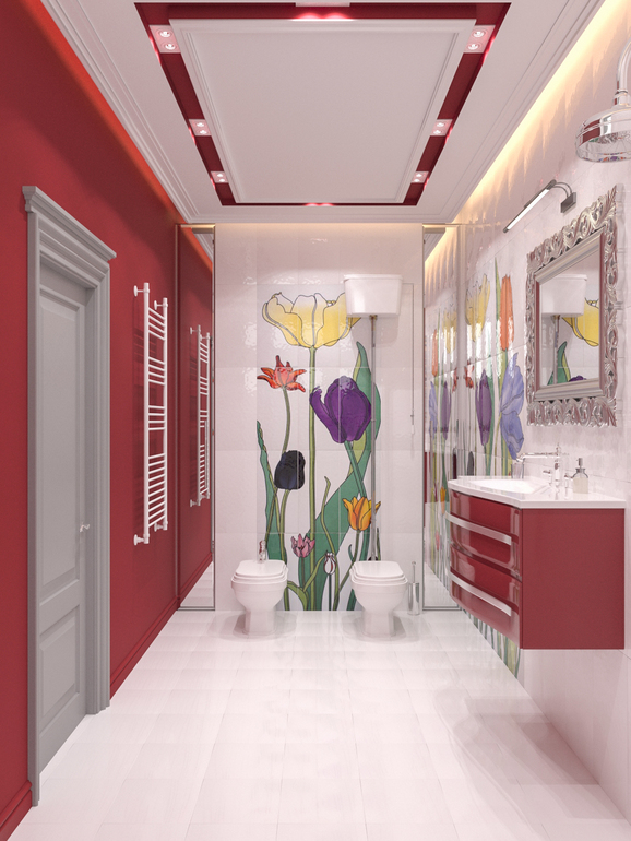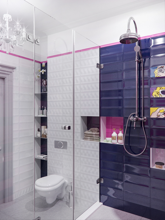 Задача не стояла сделать все в одном стиле, хотели максимум разнообразия. Это разные этажи и для разных членов семьи. Ванная Заказчицы выдержана в стиле гостиной. Концепция уже поменялась в ванных полностью.