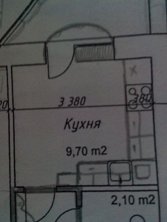 вот общая схема кухни. Справа будет холодильник в углу, какую длину гардины помоветуете по всей длине или до холодильника, я не могу представить как будет смотреться. Получается там одно окно и одна стеклянная дверь, сзади 6 узких окон на лоджии. Хотели рулонные шторы на окна а на самой кухне штора "нитка" под цвет гарнитура. Вот живое фото