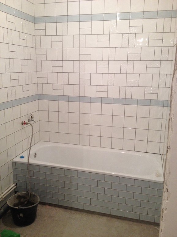 Пока без затирки, честно мне нравится результат, но сейчас я бы добавила все же багет или ряд из голубой плитки сверху и снизу панно выложила в три ряда, тогда мне кажется вышло бы гармоничнее. Кстати все, кто приходит в квартиру будь то соседи или ремонтники, все спрашивают что за плитка и цену, спрашивают дорогая ли. Конечно, самое главное, чтобы вам нравилось!