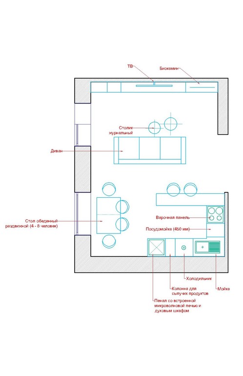 Судя по вашему плану, стояк воды у вас в нижней части, следовательно, ваш кухонный уголок должен быть внизу, зона гостиной наверху, иначе через всю площадь надо будет вести трубу канализации, т.е строить под неё короб или поднимать пол, это плохо. Теряется высота, случись засор, тоже проблема. Лучше не располагать камин и телевизор вместе. Хороший пример расположения - 1 картинка. Просто фальш -стенка на ней камин. Кухню лучше всего сделать из светлого матового материала - никогда не надоест и добавит света. Закруглённых линий не делайте -уже не модно.