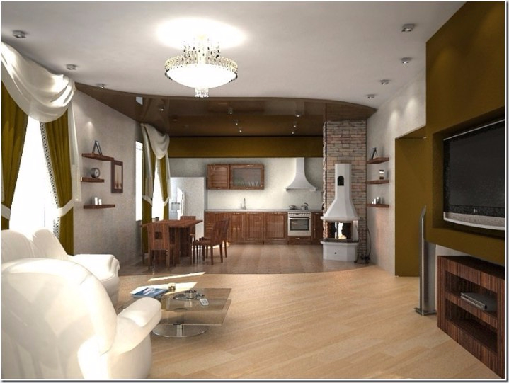 Интерьерное решение кухниДевочки здравствуйте. Эпопея с выбором кухни вроде закончилась, так теперь все вопросы как сделать кухню-гостинную??? Хочется расположить там естественно кухонный гарнитур, диван, телевизор и хочется под телевизор электрический камин, чтобы было уютнее. Помогите с советами, как это все расположить... Фото под катом