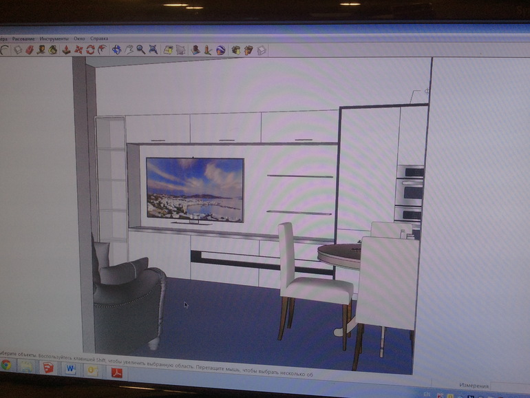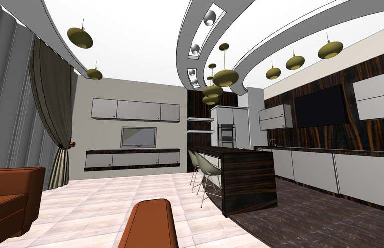 Интерьерное решение гостинойГолова уже просто кругом, когда делали дизайн проект не обратила внимание, что углы дивана и стола достаточно рядом и это начало меня реально напрягать. Как вы считаете, может быть стоит поставить круглый стол посередине, но на зоне кухни? Зона кухни отделена полукруглым потолком и полом. Теперь по поводу Гостиной, хотела сделать легкую подвесную полку под телевизор, но производители мебели предложили еще один вариант, он более законченный, но боюсь будет слишком громоздким, комната и так не большая, с левой стороны от дивана батарея, поэтому диван встанет максимум 2.10м. Очень жду ваших советов. Настало время заказывать мебель, а я в растерянности