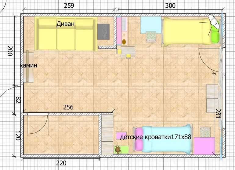 Дизайн-проекты нежилых помещенийДобрый день! Помогите, пожалуйста, советом! Имеем одну комнату с эркером: в ней надо разместить детскую спальню, игровую зону, зона для отдыха (телек) и большой шкаф для всей семьи. Детей будет двое с разницей 2 года. Вот что у меня получилось пока что! Очень буду рада и признательна, если кто-то что-нибудь подскажет!:)