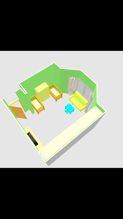 у меня еще только картинки пока))) пока ремонт не окончен.Окончательная планировка такая, с возможностью менять местами наш диван и детские кроватки. Пока они у двери (пока окно не поменяем). На дневной сон малыми шторками отгородим детей, а на ночь поперек комнаты)))