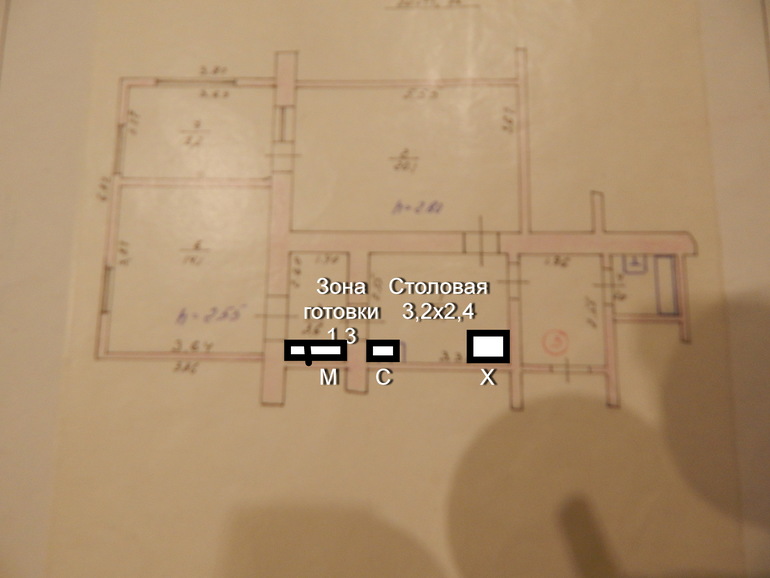 Интерьерное решение кухниДевчонки, имеется кухня-столовая, состоящая из 2-х зон, разделенных стеной. По задумке хочу зону готовки сделать как раз отдельно. Обозначила М мойку и плиту.