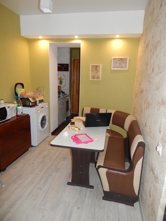 На стенах оливковые обои в комбинации с золотистыми. Пол светлый, типа беленый дуб, а в зоне готовки коричневая глянцевая плитка. Техника : стиралка и холодильник белые.