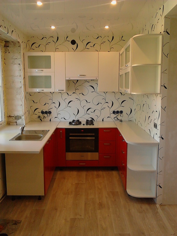 У меня вот так. Кухонный белый верх, красный низ. Столешница белая, в темную мелкую крапинку.