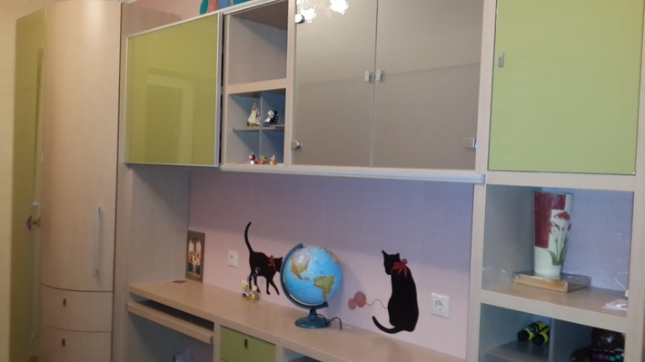 От стекла бы не отказывалась, легче конструкция выглядит. Полочки над столом слева очень гармонично туда вписались. Шкаф вообще ничем разбавлять не будете? Так и будет стоят огромным неоформленным пятном? Почему без зеркала? Комната девочки, зеркало не помешает