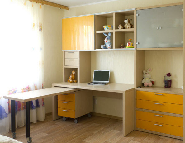 На мой взгляд, выкатной стол - это лишнее. На нем вечно будет "творческий беспорядок". Вместо него я бы поставила второй стул (для родителя, который уроки проверяет). А ещё, стоит обратить внимание на высоту полок над столом. Надо иметь ввиду, что по многим предметам учебники высокие - чтобы их удобно было ставить на полку и, соответственно, брать с полки.