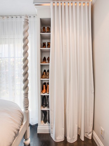 Я бы повесила шторочку в тон к обоям от верхней полки, то есть верхняя полка с коробками открытая, а от нее штора до пола. Будет хорошо смотреться. Вешайте обычную штору, не нужно рулонную.