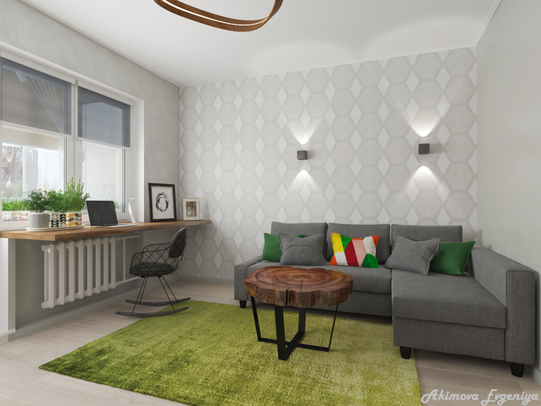 4. еще этот цвет я использовала в квартире для одного молодого мужчины, который был не против соединения сканди, эко и модных акцентов. Тут пантон использован и в фасадах кухни, и а текстиле гостиной, ну и не совсем пантон на балконе.