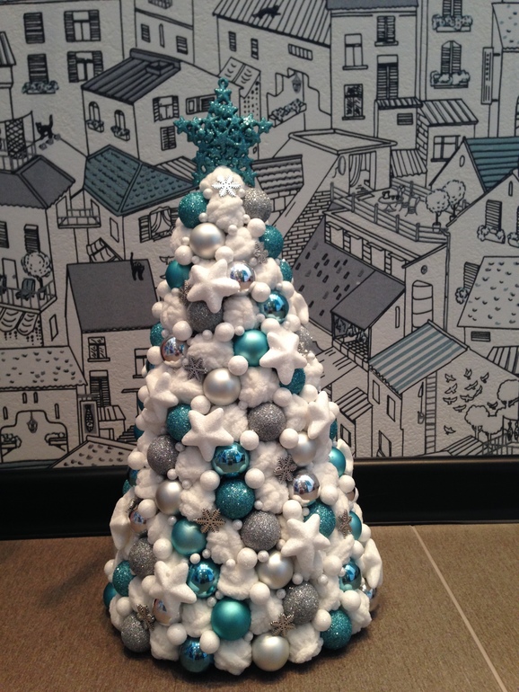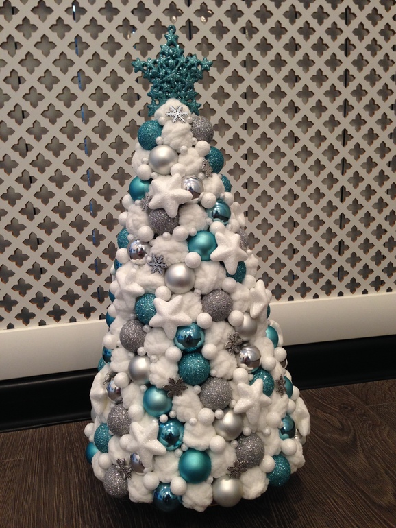 Спасибо большое, Ольга! На конус из пенопласта прикрепляем елочные игрушки и такого же размера клубочки из пряжи (у меня пряжа пушистая), затем места стыков игрушек и клубков закрываем декоративными звездами и горошинами. Все прикрепляем с помощью клеевого пистолета.